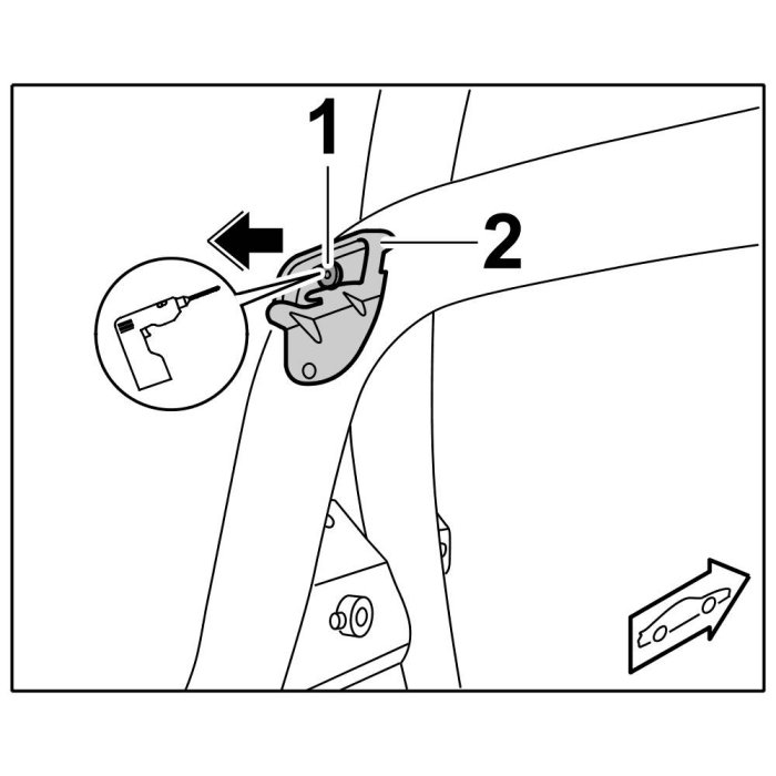 4. Drill out the blind rivet -1- on the latch for the centre part of the wind deflector -2- using a 5-mm drill bit. Latch for centre part of wind deflector -arrow-