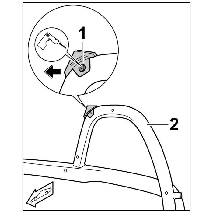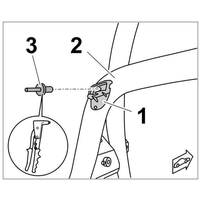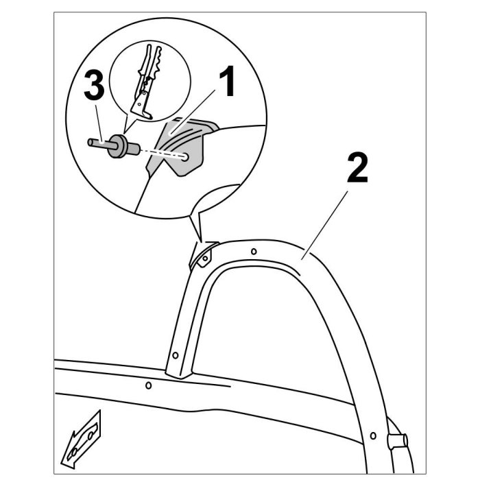 1. Fit lower part of rubber stop -1- on the roll-over bar -2- from the rear, position correctly and secure with a blind rivet -3-.