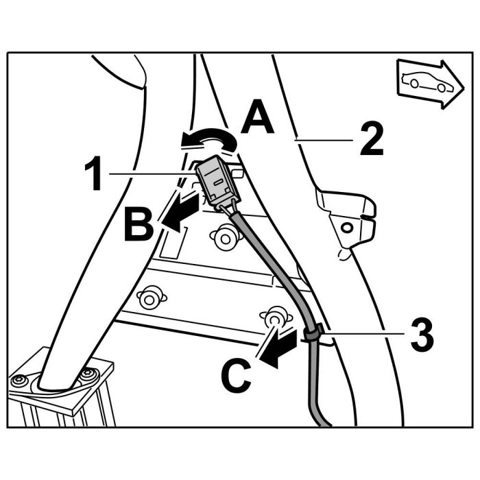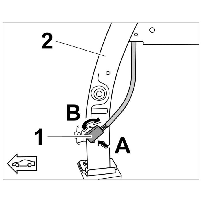 1. Insert the central connector at the top with retaining clip -1- and wiring harness on the roll-over bar -2- from the inside -arrow A- and lock by turning it to the right -arrow B-.