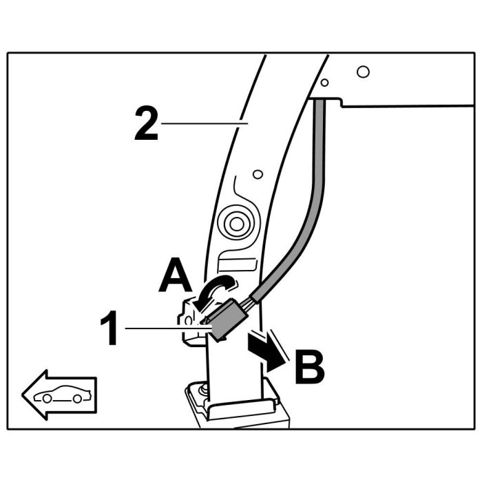 1. Release central connector at the top with retaining clip -1- at the roll-over bar -2- in -direction of arrow A- and remove it -arrow B-.