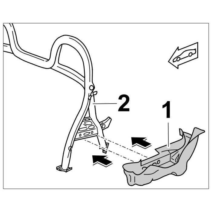 2. Fit water drip pan -1- on the roll-over bar -2- ( -arrows- ) and position it at the hole pattern on the hood support fastening point.