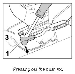 2. Carefully press the ball socket -1- at the left and right with a screwdriver while keeping it tight to the ball head -3- on the convertible top support.
