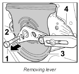 1. Unscrew the fastening screw -1- on the lever -2-. Remove friction washer -3- and lever -2- from the convertible top gears -4-.
