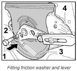4. Position friction washer -3- and lever -2- on the convertible top gear -4- and secure with the fastening screw -1- (micro-self-locking).