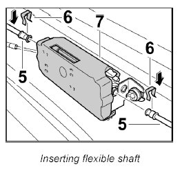 5. Insert the flexible shaft -5- into the drive motor -4- and secure with the clip -6-.