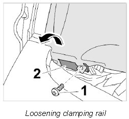 3. At the front of the B-pillar (main folding top bow), unscrew the fastening screw -1- and swing the clamping rail -2- upwards.