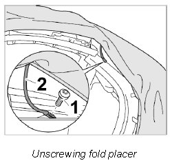 1. Unscrew fastening screws -1- of fold placer -2- at left and right.
