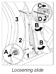 2. Pull out slide -2- from main folding top bow -Arrow B-, disengage cord -3- -Arrow C- and remove by the loop -Arrow D-.