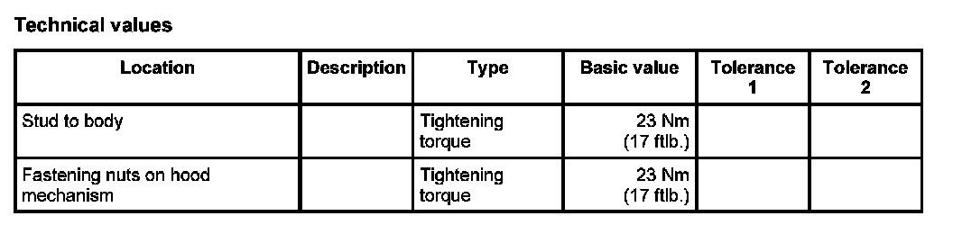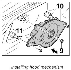 1. Position hood mechanism -10- on the studs -11- and secure with the fastening nuts -9-. Tightening torque: 23 Nm (17 ftlb.)