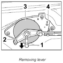 3. Unscrew the fastening screw -1- on the lever -2- and remove the cover -3- and lever -2- from the hood mechanism -4-.