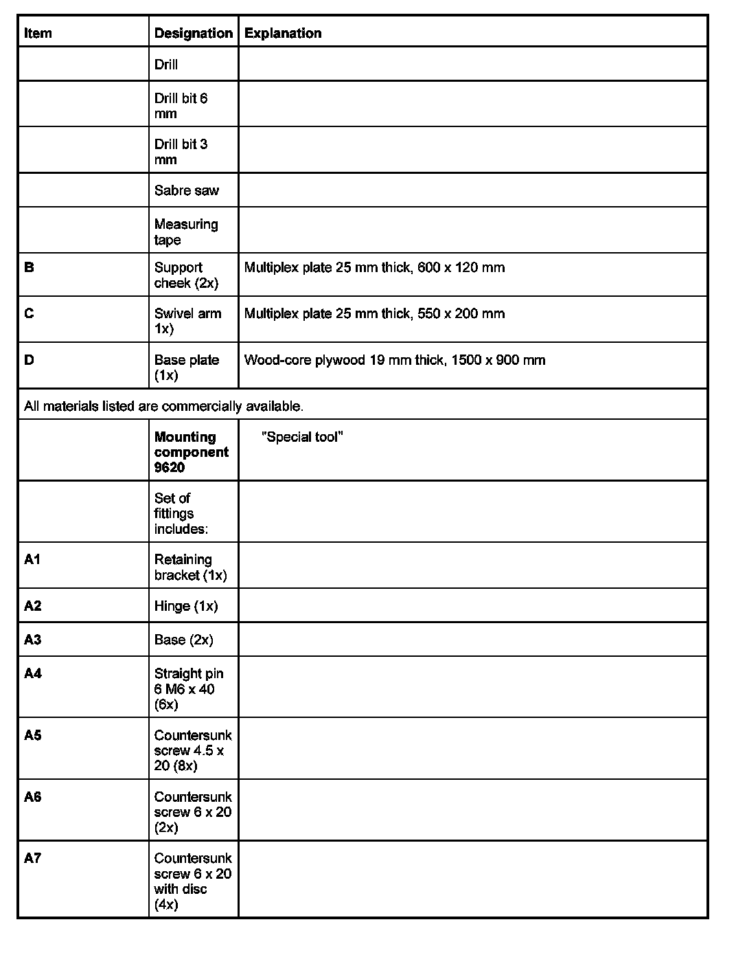 The following tools and materials are required to construct the fixture for work in the inner area: