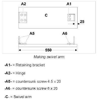 1.2. Fit hinge -A2- with 4 countersunk screws -A5- following the dimensions specified on the swivel arm -C-.