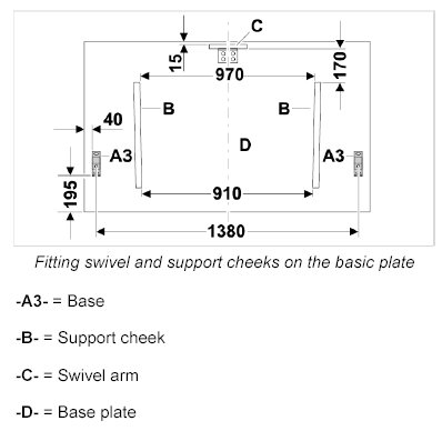 1.1. Fit retaining bracket -A1- with 2 countersunk screws -A6- following the dimensions specified on the swivel arm -C-.