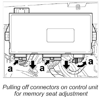 2. Unlock and pull off the three connectors on the control unit for memory seat adjustment -arrows a-.