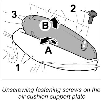 4. Fold the air cushion for the seat -1- aside -Arrow A- and unscrew the two fastening screws -2- on the air cushion support plate -3-.