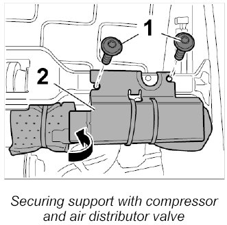 7. Position support -2- with connected motor and air cushion control valve and screw down with the two fastening screws -1-.
