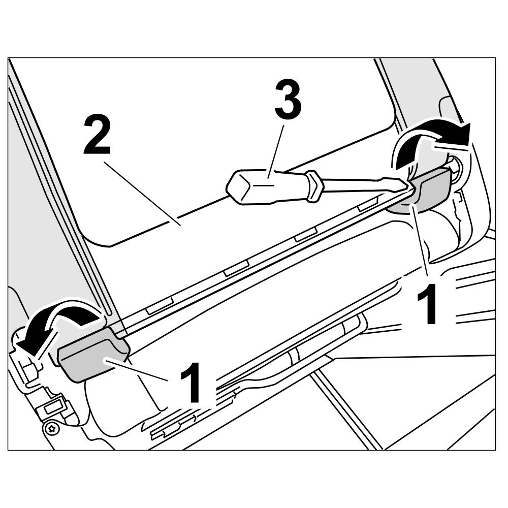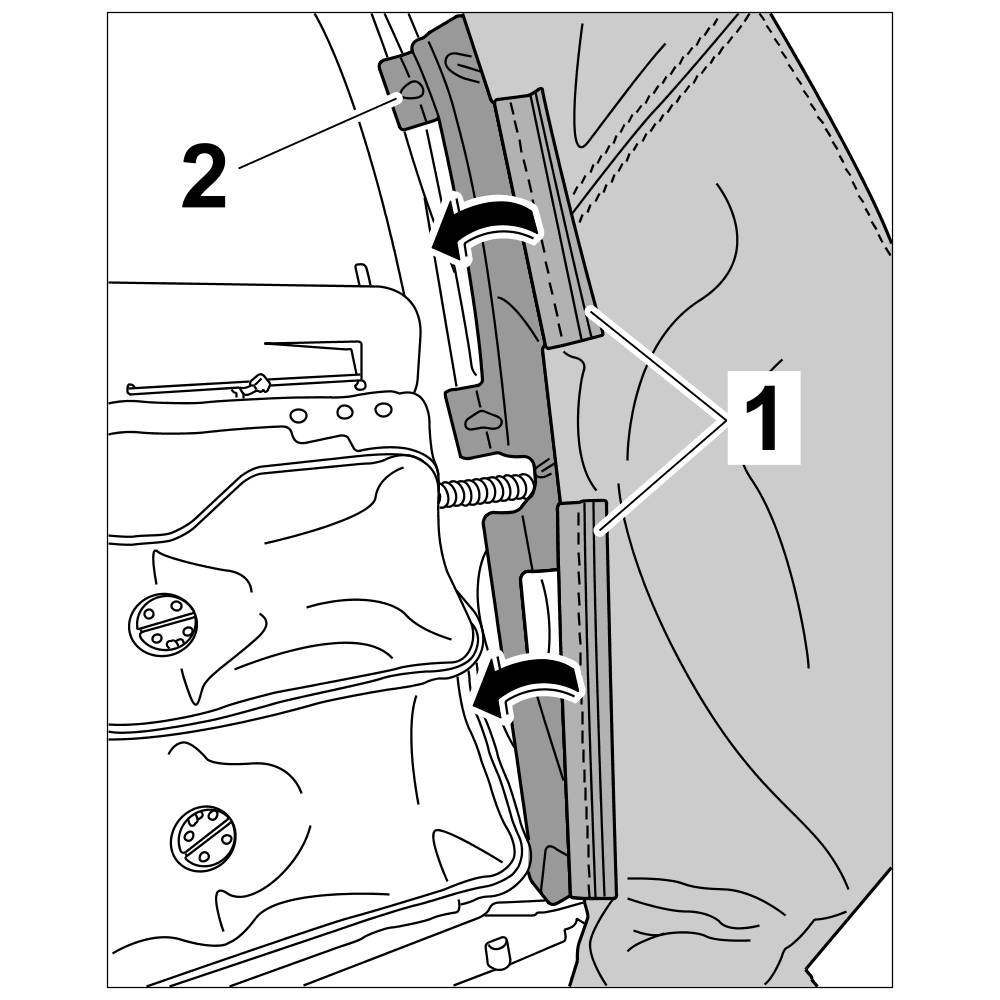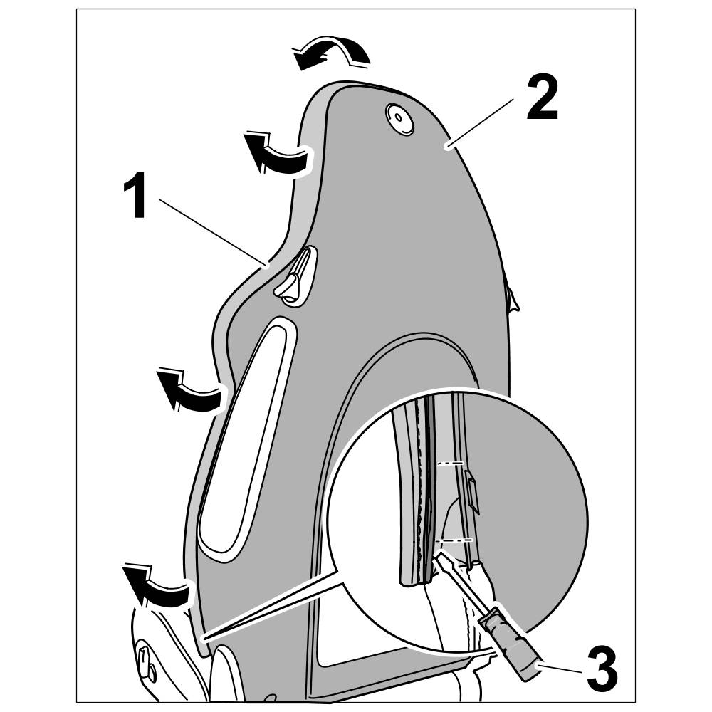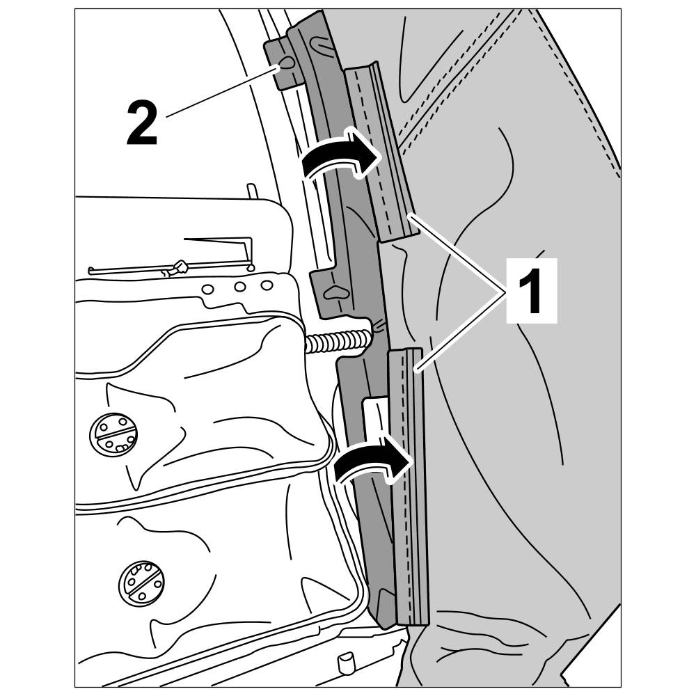 11. Press cover for backrest -1- into the cushion carrier -2- lower left and right using a plastic wedge -3-.