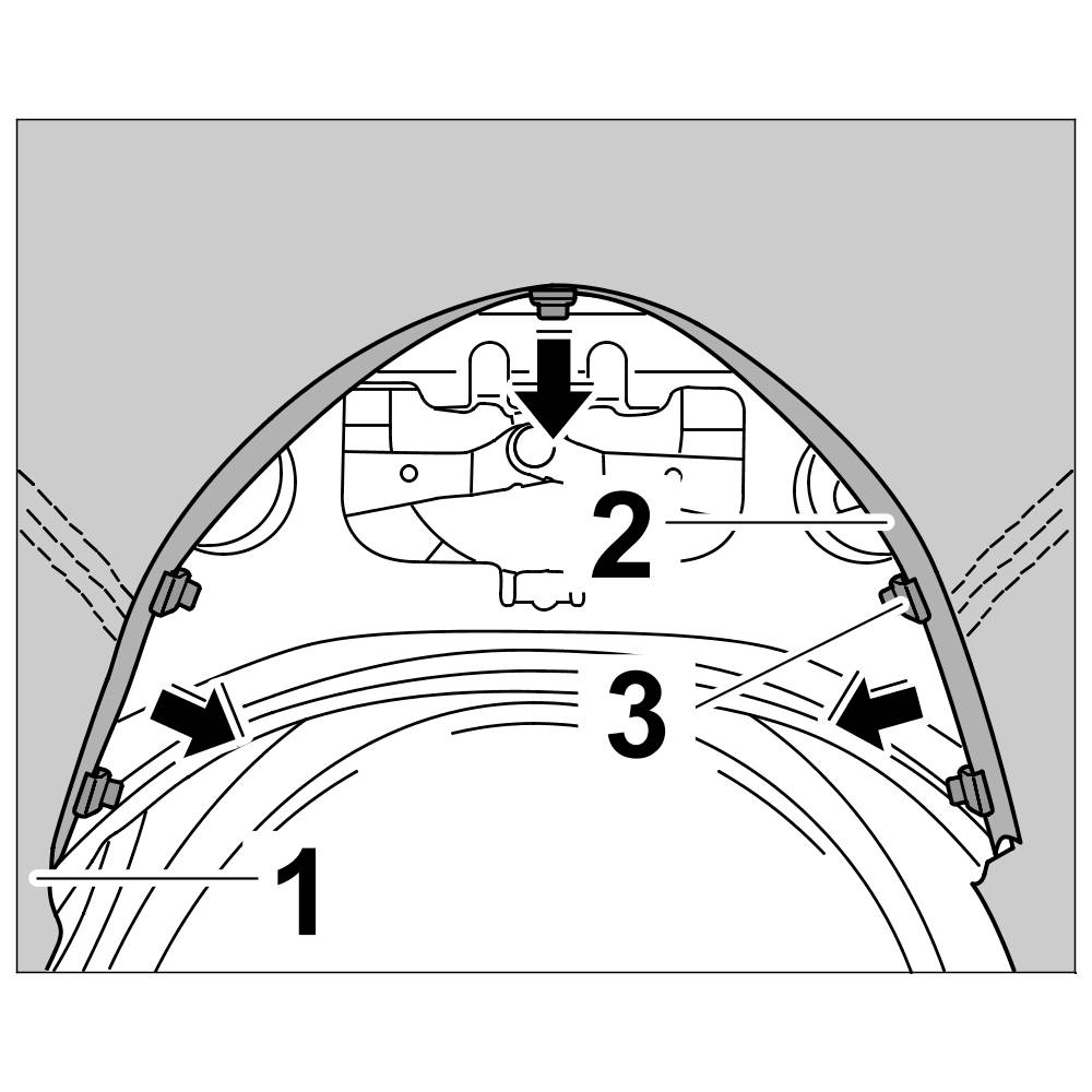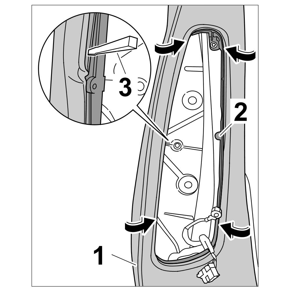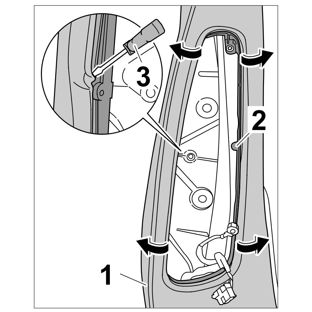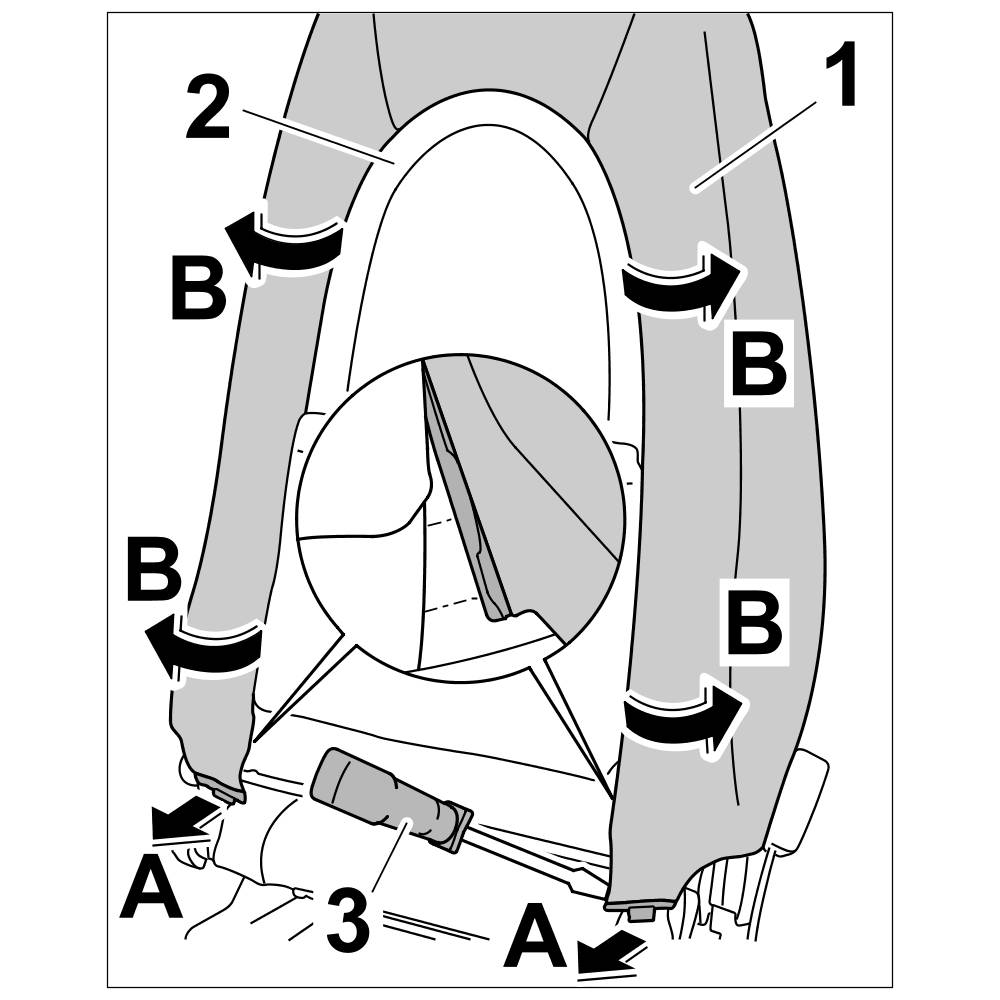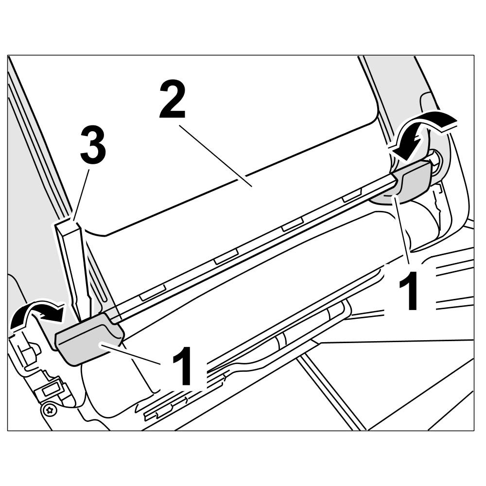11. Press cover for backrest -1- into the cushion carrier -2- lower left and right using a plastic wedge -3-.