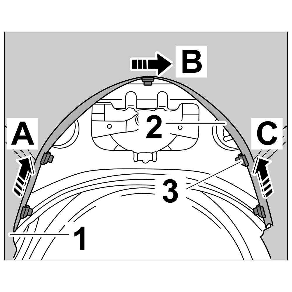 4. Push out plastic strip -2- on cover for backrest -1- from the fixing clips -3- in direction of arrow -A, B, C-.