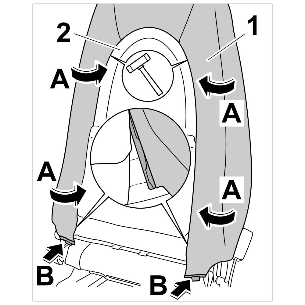 6. Press connection of backrest cover -1- at the rear into the cushion carrier -2- -Arrows A- and tap gently into place (plastic hammer).
