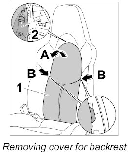 2. Insert your hand into the top of the backrest cover -1- and disengage it by pulling it up out of the backrest frame -2- ( -arrow A- ). Then press cover for backrest together slightly in the middle -arrows B- and pull forwards and out.