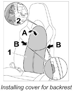 3. Press in cover for backrest -1- in the middle -arrows B- until the locking tabs engage -inset-.