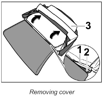 3. Carefully detach Velcro strip -1- on the cover from the Velcro fastener on the front of the padding -2- ( -arrows- ).