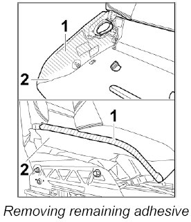 3. Remove remaining adhesive -1- and clean the contact surfaces of the seat shell -2- with cleaning agent.
