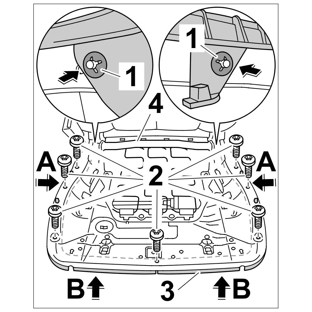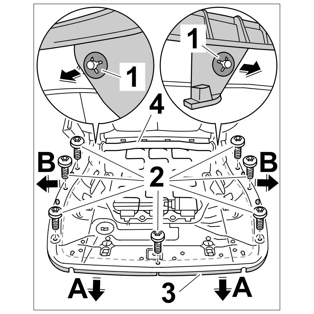 2. Unscrew fastening screws -2- , pull frame for seat surface -3- downwards -arrow A- and remove outwards -arrow B- from the seat frame -4-.