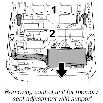 1. Unscrew the two fastening screws -1- and remove control unit for memory seat adjustment together with the support -2- from the seat frame.