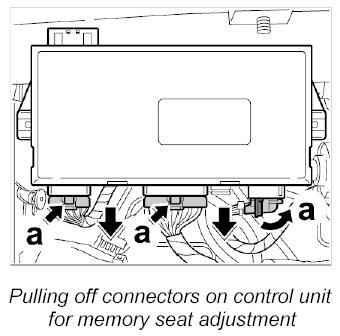 2. Unlock and pull off the three connectors on the control unit for memory seat adjustment -arrows a-.