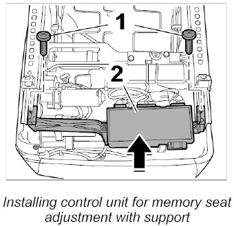 2. Position control unit for memory seat adjustment with support -2- on seat frame and secure with both fastening screws -1-.
