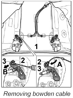 1. Disengage bowden cable at the left and right on the upper part of the lock.