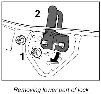 4. Unscrew fastening nuts -1- and remove lower part of lock -2- - -arrow-