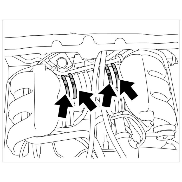 1. Undo four screw-type hose clamps -arrows- on resonance tube.