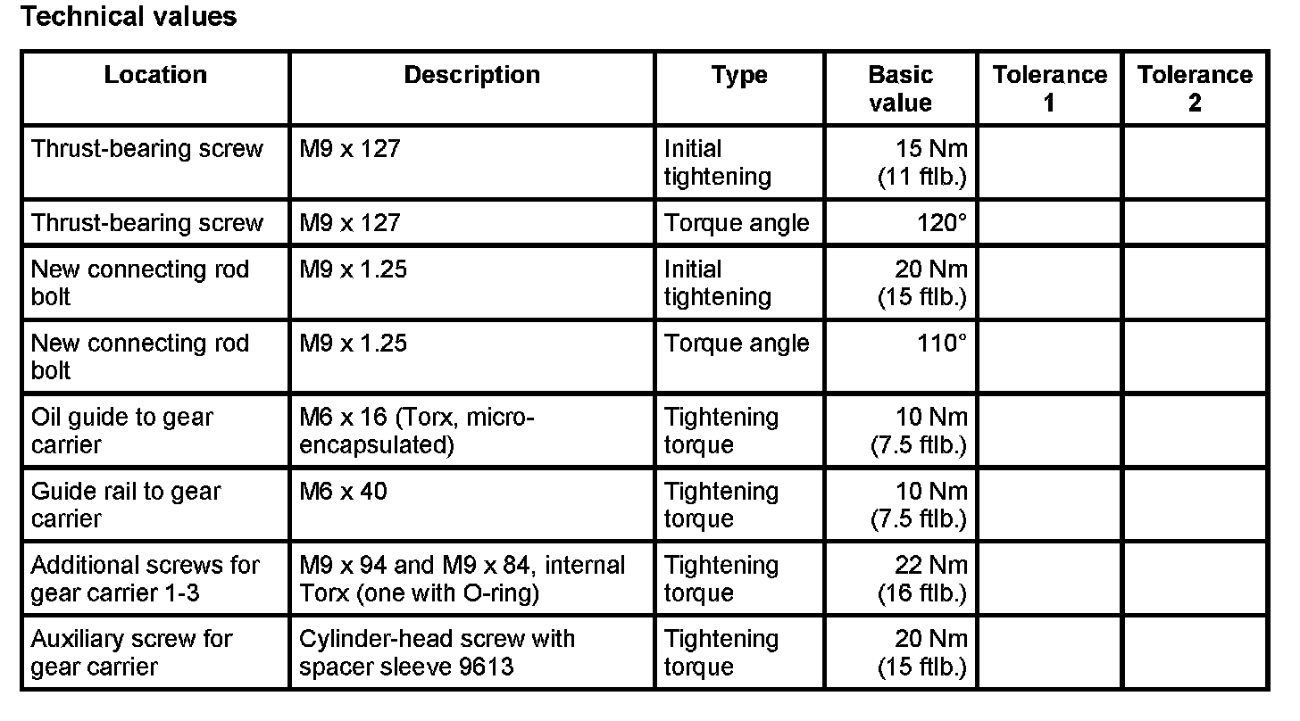 12. First, screw in connecting rod bolts to the required torque and tighten to the specified torque angle. Then loosen the bolts again. The final tightening is performed again with an initial tightening per the torque and the final tightening is performed with the torque angle wrench. --> Initial tightening: 20 Nm (15 ftlb.); --> Torque angle: 110°