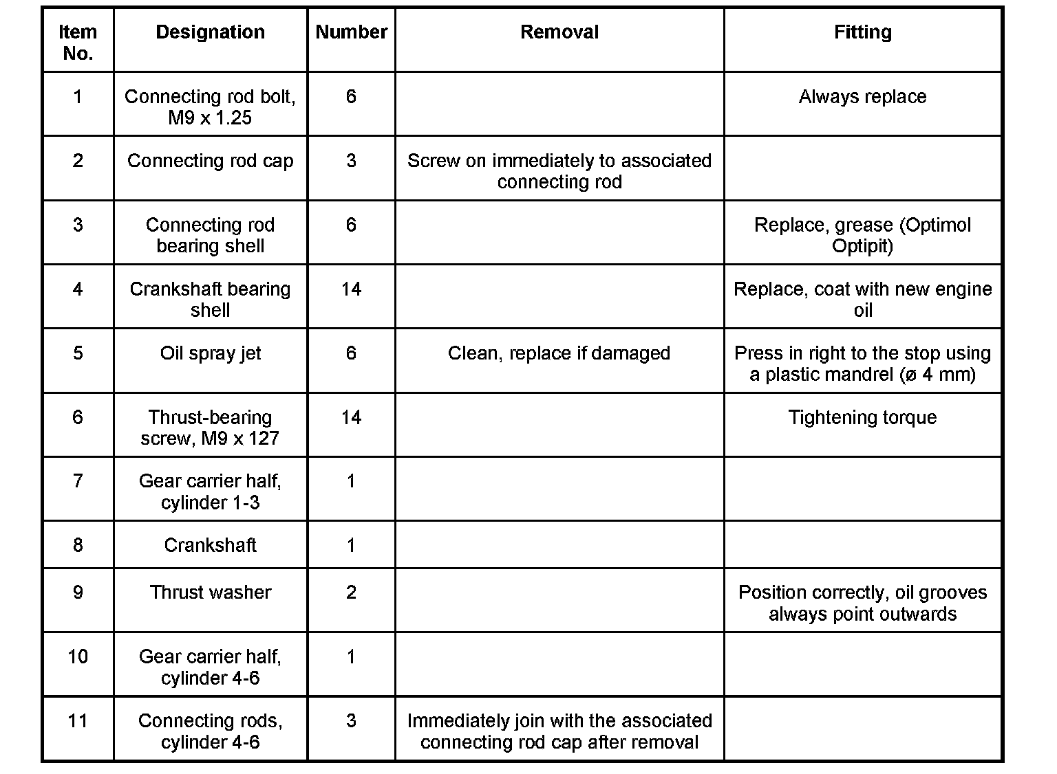 6. Place gear carrier half on a clean surface, remove seven crankshaft bearing shells and three oil spray jets for piston cooling.