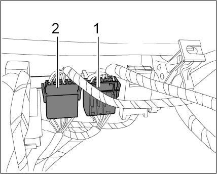 15. Release and pull off connectors -1- and -2- above the left wheel arch.