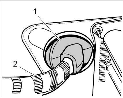 16. Press the rubber sleeve -1- on the luggage compartment rear wall inwards and guide the engine wire harness -2- towards the engine compartment, if the engine is to be lowered later.