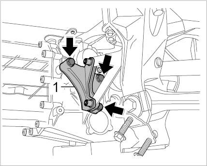 52. Loosen the three M10 screws -arrows- on the right transmission support.