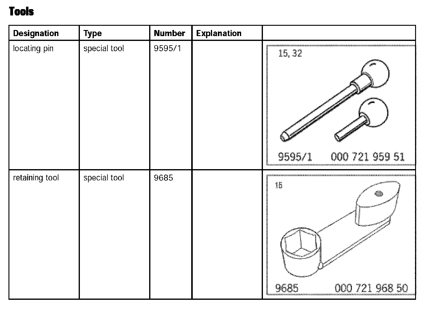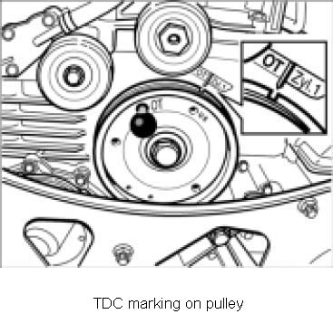 2. Disassembling cylinder bank 1 - 3 Turn crankshaft at the pulley/vibration balancer clockwise to the overlapping TDC of cylinder 1. Disassembling cylinder bank 4 -6 Turn crankshaft to the TDC for cylinder 4. Using a locating pin 9595/1 fix the pulley or vibration balancer .