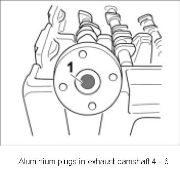 Additional identifying feature for exhaust camshaft 4 - 6: Aluminum plugs with lubrication bore -1- for tandem pump
