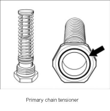- Primary chain tensioner on crankcase (oil filter area), identification: one ring-arrow-