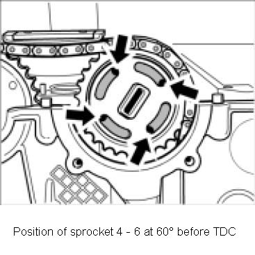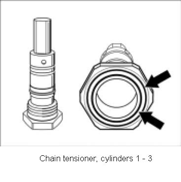 32. Fit chain tensioner for side 1-3 (hexagon a/f 32) before turning crankshaft to the TDC mark. Fit chain tensioner with new sealing ring and tighten. Tightening torque: 59 ft lb. After adjusting the timing, this should be re-checked.