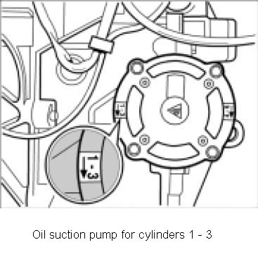 6. Remove oil suction pump for cylinders 1 - 3. Unscrew four Torx screws M6 x 20 (micro-self-locking), remove oil suction pump, and replace O-ring and screws.