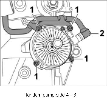 3. Fit oil suction pump (1 - 3) and tandem pump (4 - 6) with new, micro-self-locking Torx screws M6. Replace O-rings and grease with Optimol MP3. Fit vacuum line with new O-rings at tandem pump. Tightening torque: 7.5 ft lb.