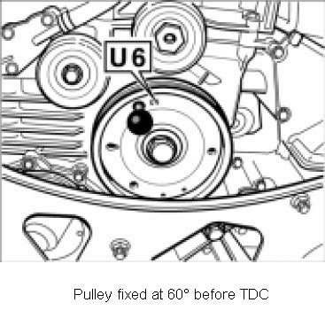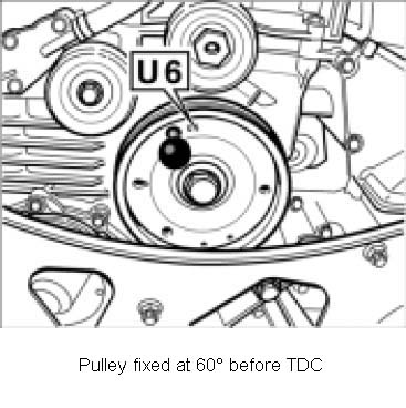 23. Turn the crankshaft by means of the pulley or vibration balancer clockwise (running direction of engine further still until the marking U6 on pulley or vibration balancer coincides with fixing bore in crankcase (60° before TDC). Fix with locating pin 9595/1.
