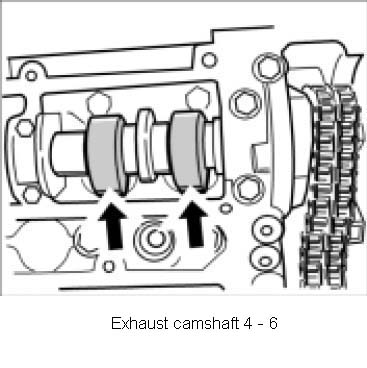 6. Insert exhaust camshaft 4-6. Lay the timing chain on the flange for the sprocket, then insert the camshaft at overlapping TDC of cylinder 4 (the outlet cams of cylinder 4 point towards the cams of the inlet camshaft -arrows-).