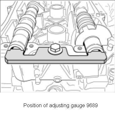 12. Using special tool adjusting gauge 9686, fix camshafts (if necessary with the gauge twisted) with an M8 screw (e.g. hexagon-head bolt M8 x 16). The flat tool face points upwards. Screw in fastening screw by hand.