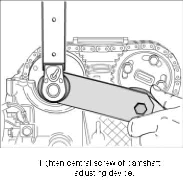 13. Screw the housing screws of the inlet and exhaust camshafts and the auxiliary screw of the adjustment gauge alternately by approximately another 90° until the specified tightening torque is reached. Tightening torque: 7.5 ft lb.; Tightening torque: 17 ft lb.